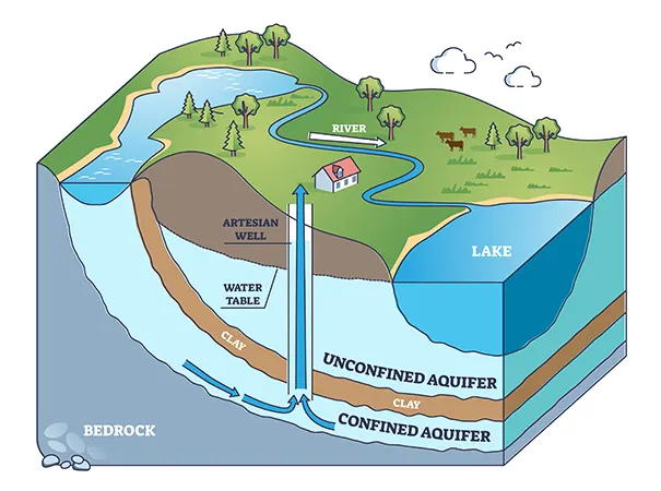 In Florida, most of the freshwater we use comes from underground aquifers made of porous rock, such as limestone or sandstone, that store and transmit water. In South Florida, aquifers vary in depth and composition, but the primary source of drinking water is the Surficial Aquifer System, a shallow and widespread aquifer located about 100 to 300 feet underground and separated from deeper aquifers by a confining soil layer.