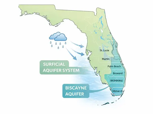 The Biscayne Aquifer, part of the Surficial Aquifer System, covers more than 4,000 square miles and is the most heavily used water source in Florida, supplying water to over 5 million people in Miami-Dade, Broward, and southern Palm Beach counties.
